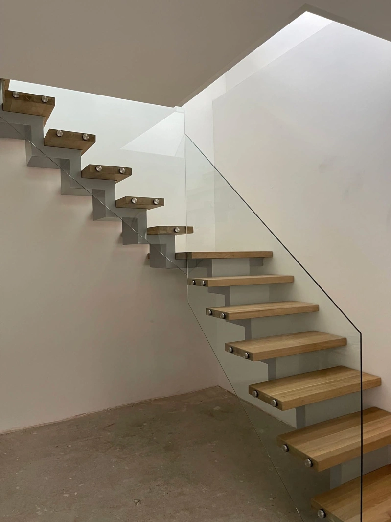 Treptele din lemn au fost realizate în colaborare cu TamHome, rezultând un ansamblu modern, sigur și elegant, ce îmbină armonios metalul, sticla și lemnul.